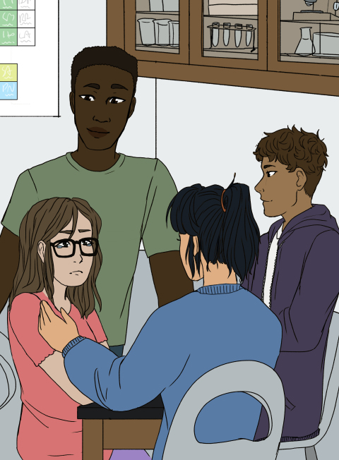 Just then, Carlos and Marcus walked by the empty classroom and heard their voices. Hannah filled them in and they shared her outrage.