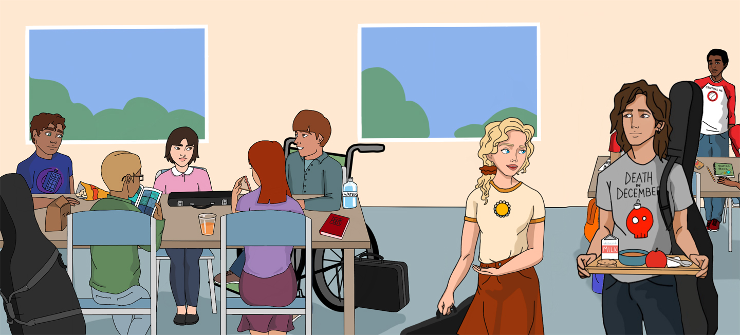 “Well,” said Charlene, “might as well make the best of it. How about joining me at our lunch table? Some of us from the band hang out in the back corner over there.”